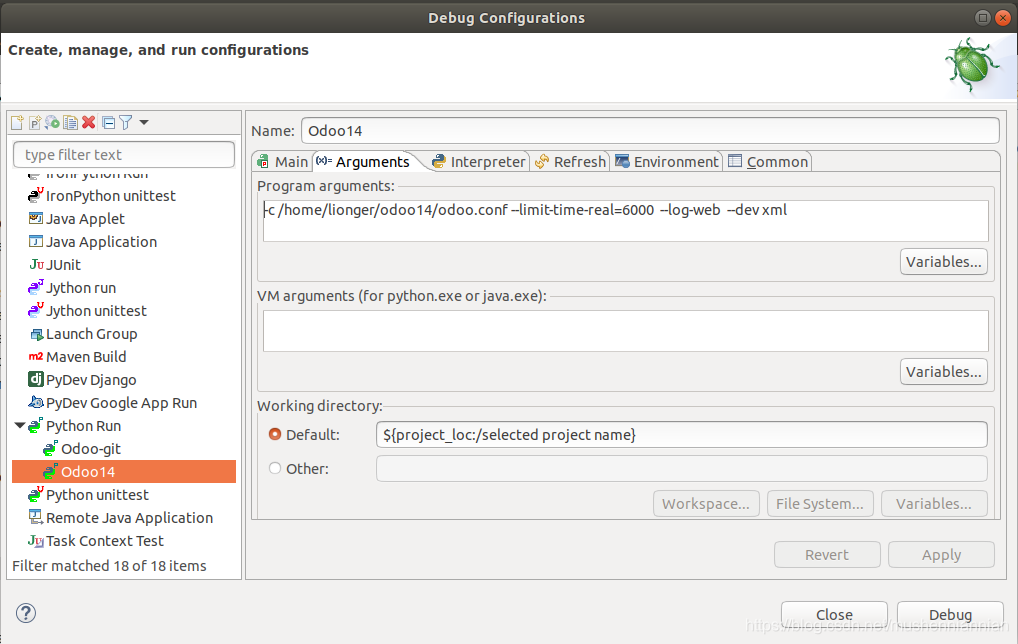 首先将源码中的setup/odoo文件复制到项目更目录下并更名为odoo.py,然后在Debug或Run按钮下点击Debug Configurations…创建一个启动配置。