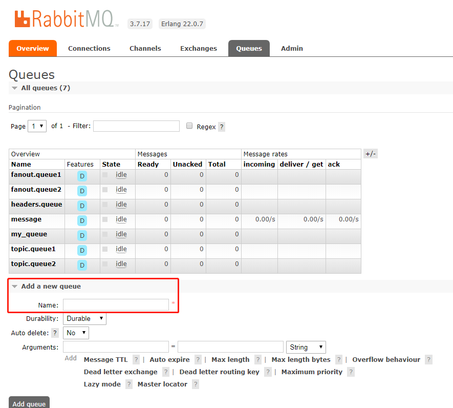 2.2 进入控制台http://IP:15672/,需要根据业务需要新建queues