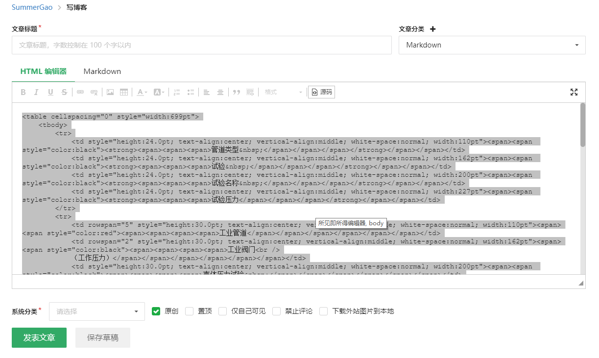 ② 将已编辑好的Excel表格复制到博客中。