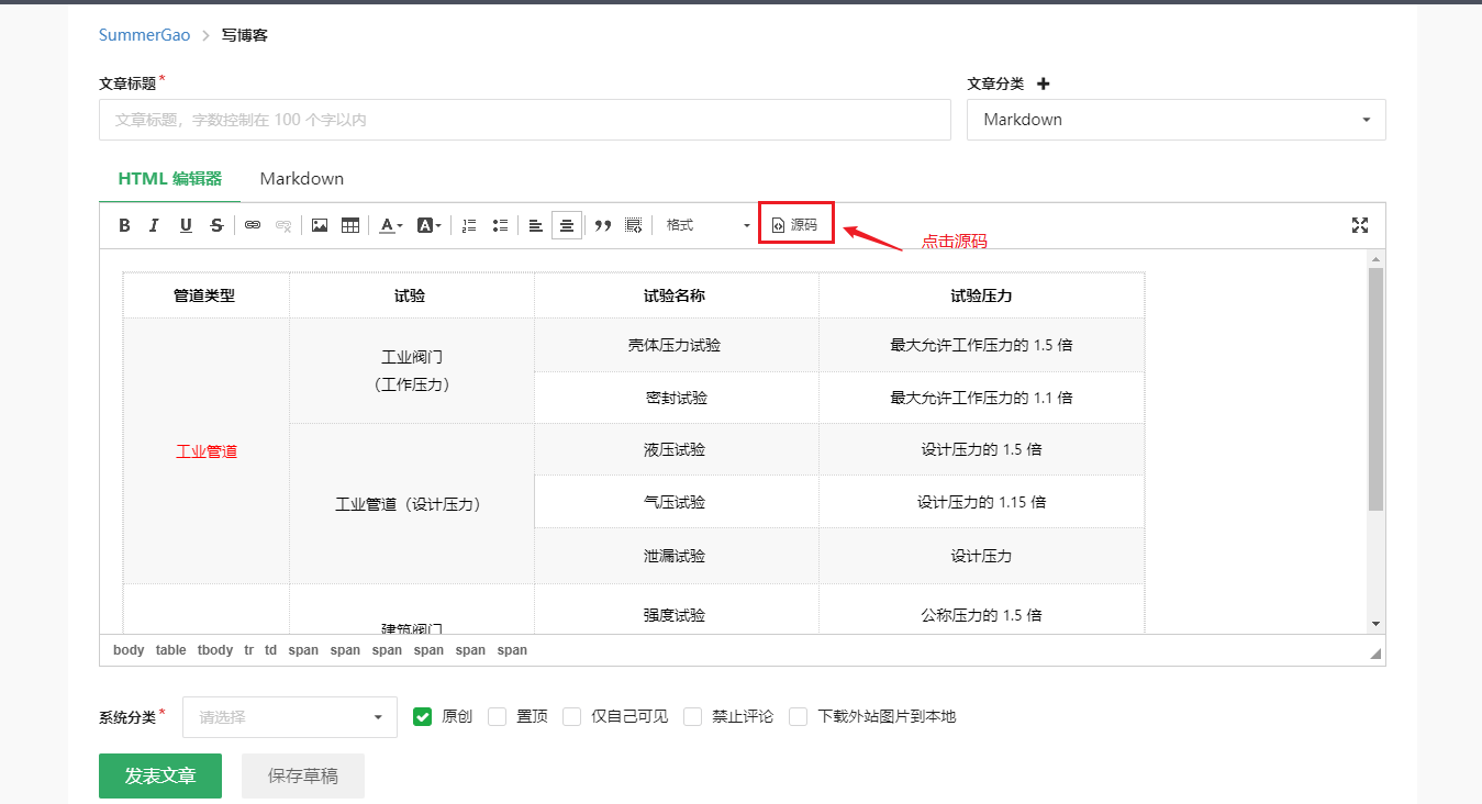 ③ 预览博客中的表格没问题后点击源码按钮。