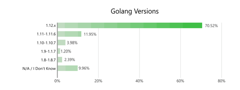 绝大多数的Go开发者都在使用最新版本的GoLang。超过70%的受访者表示使用的是最新版本的Go 1.12。
