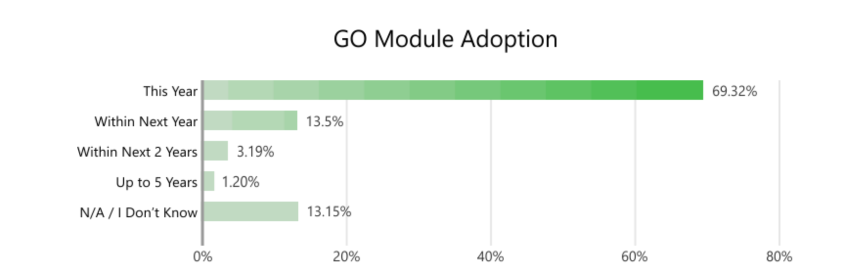 几乎同样多的使用最新版本的Go开发人员也报告在他们的组织中采用了Go Module。也有相当多的人希望尽快使用Go Module,这样到2020年中期,其使用率将上升到至少80%,并可能接近100%。