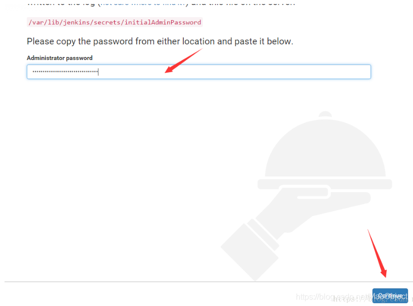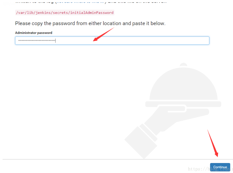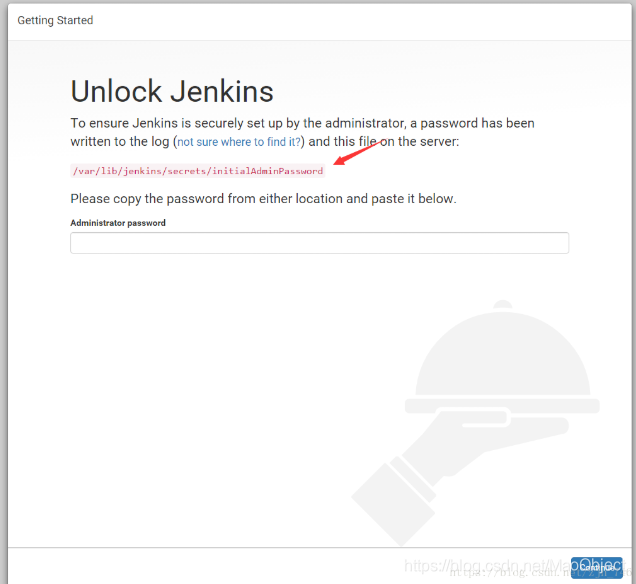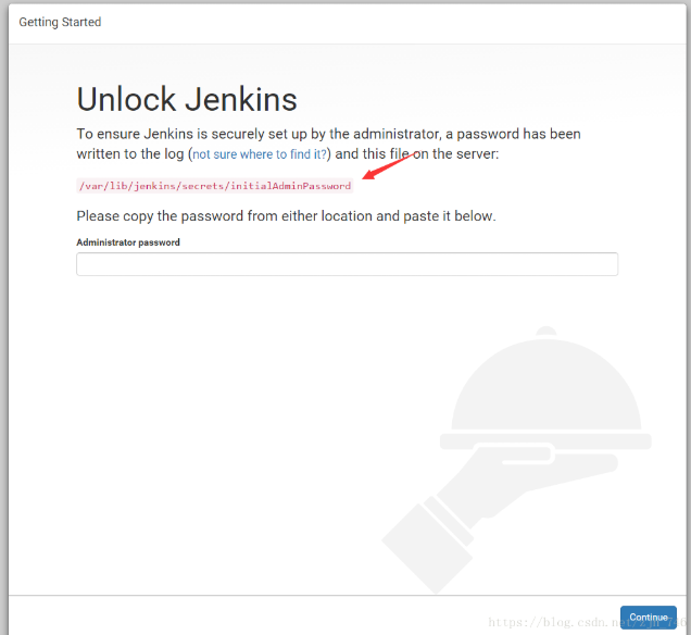 访问jenkins ip+端口(图1 默认8080)第一次登录Jenkins会要求解锁,打开红色标记中的路径,取出password,填入上图,点击continue