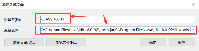 变量值为:jdk文件夹下的lib文件夹地址+\dt.jar;jdk文件夹下的lib文件夹地址+\tools.jar (注意:两个地址之间加“;”隔开)