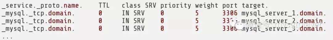 MySQL Router 是 InnoDB Cluster 架构的访问入口,在架构部署上,官方给出的建议是 router 与应用端绑定部署,避免 router 单点问题。 之前还有客户咨询,能否 router 不与应用端绑定部署,不便于部署,在此之前都需要在 router 前面加 VIP 或者一层负载均衡。 我还在想这事儿就应该由 MySQL Connector 来实现访问链路的 Failover 和 Loadbalance, 现在有了 DNS SRV 的支持,router 不必和应用端绑定部署,也可以省了 VIP 和负载均衡,MySQL InnoDB Cluster 方案更加完善,配合 consul 等服务发现组件,更容易适配 service mesh 架构。 DNS SRV 是 DNS 记录的一种,用来指定服务地址。SRV 记录不仅有服务目标地址,还有服务的端口,并且可以设置每个服务地址的优先级和权重。