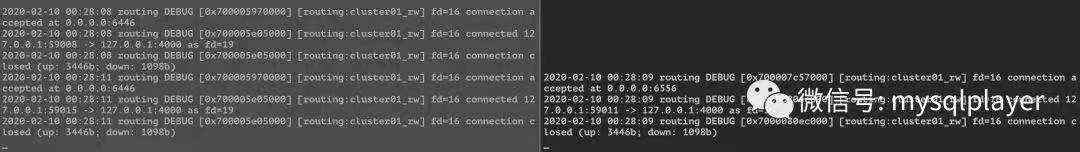 从 MySQL Router 日志中可以看到请求以负载均衡方式发送到两边。
