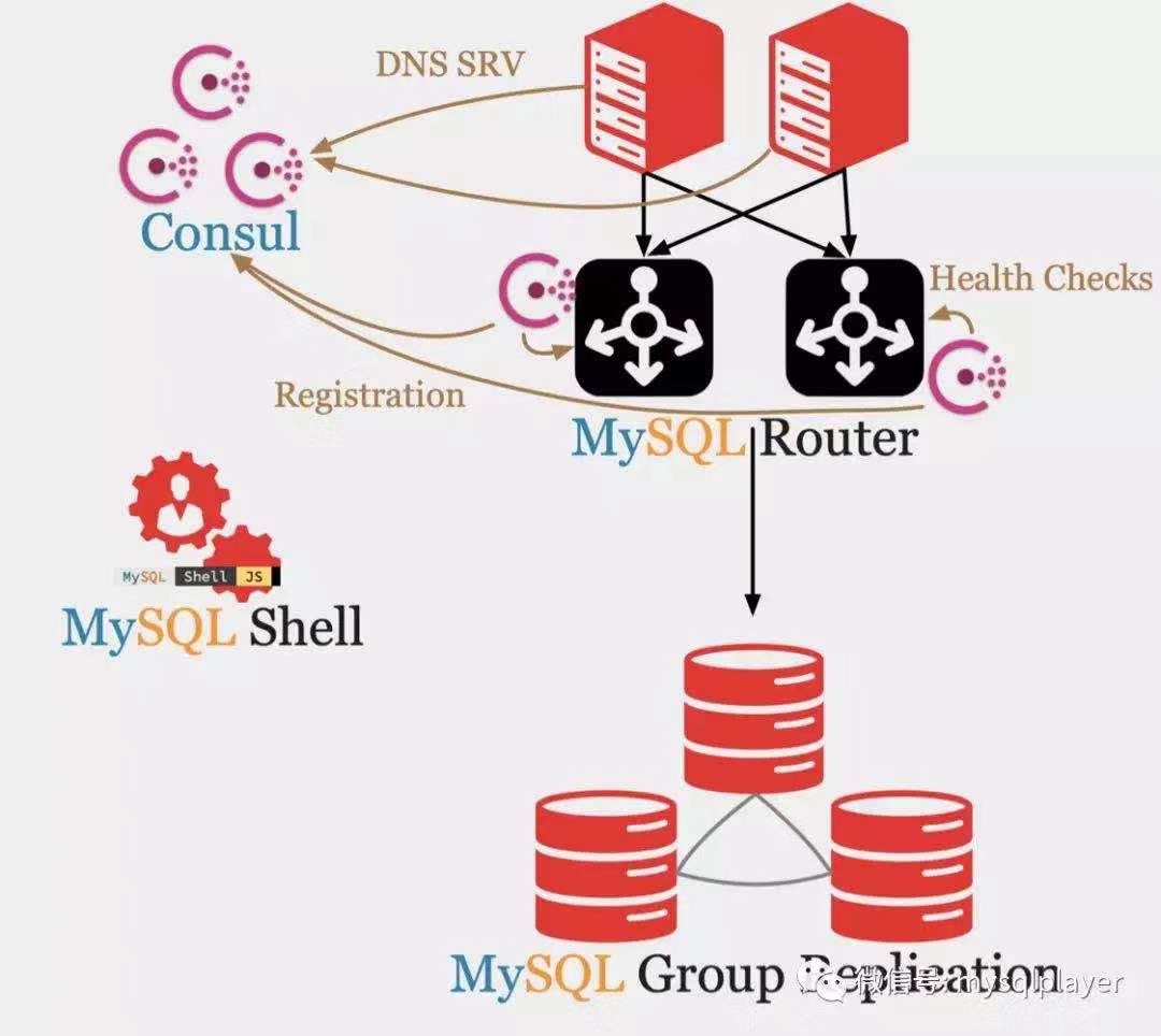 consul agent 与 MySQL Router 部署在相同节点,检查服务活性,并向 consul server 注册服务信息。 应用端的 Connector 配置了服务地址,访问 DB 时先向 consul server 发起 DNS SRV 服务请求。 consul server 回复应用端 MySQL Router 的服务地址和端口,应用端再去访问 MySQL Router。