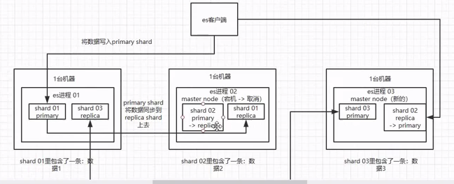 如果是非master节点宕机了,那么会由master节点,让那个宕机节点上的primary shard的身份转移到其他机器上的replica shard。急着你要是修复了那个宕机机器,重启了之后,master节点会控制将缺失的replica shard分配过去,同步后续修改的数据之类的,让集群恢复正常。