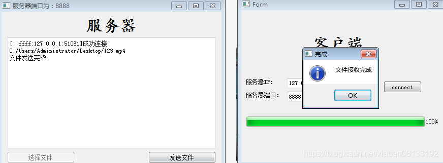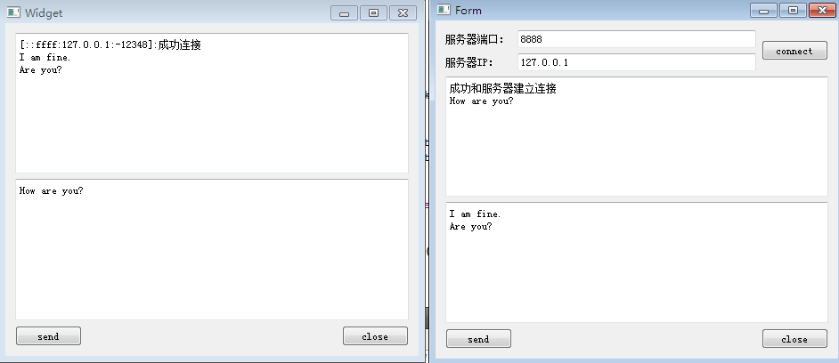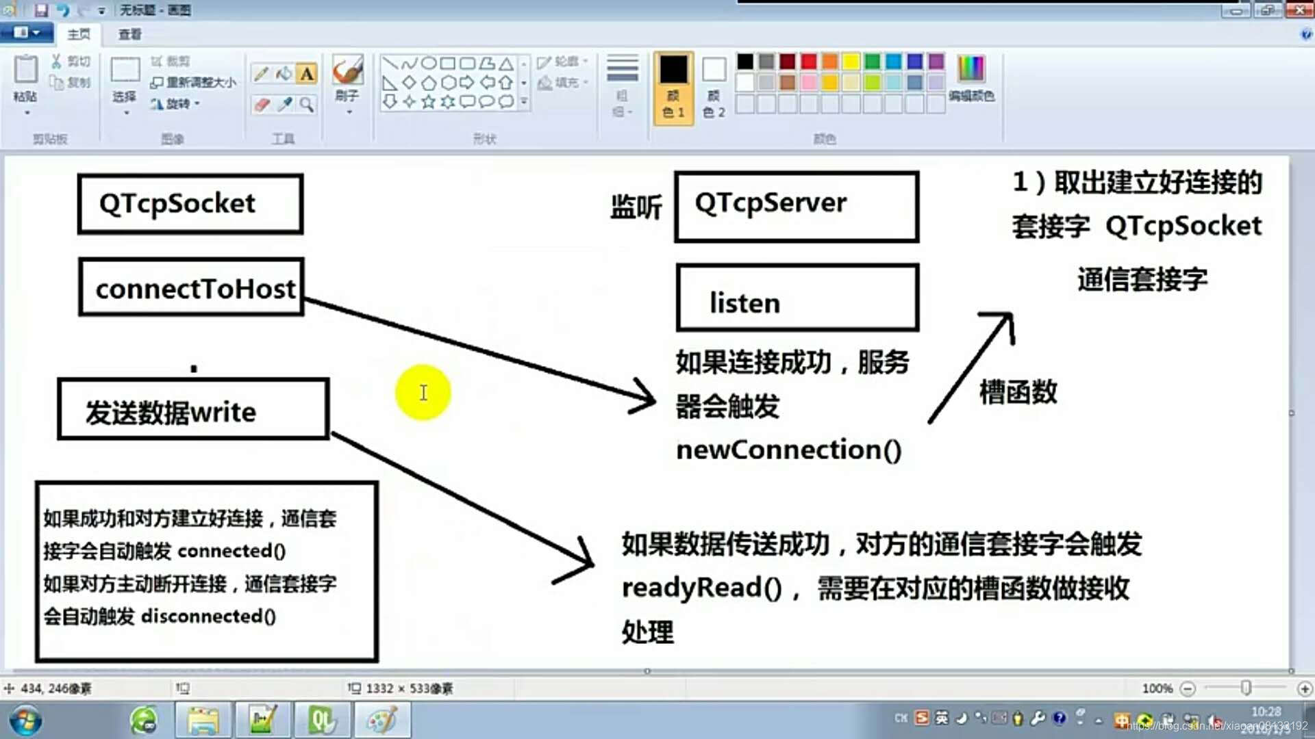 Qt中服务器端也有两个套接字,其中一个类似QTcpServer(监听套接字),然后Linux中的bind和listen合在了一起为listen()函数,另一个通信套接字是QTcpSocket(通信套接字)。连接的时候有一个connectToHost(),但是通信的时候是一种信号和槽的连接,当主动连接的时候,成功后,服务器端会收到一个newConnection()信号,然后就会触发槽函数,参函数就会取出建立好连接的套接字 QTcpSocket()。 如果成功和对方建立好连接,通信套接字会自动触发connected();如果对方主动断开连接,通信套接字会自动触发disconnected()信号。发送数据的时候,如果发送成功,对方的通信套接字会触发readyRead()信号,需要在对应的槽函数做接收处理。