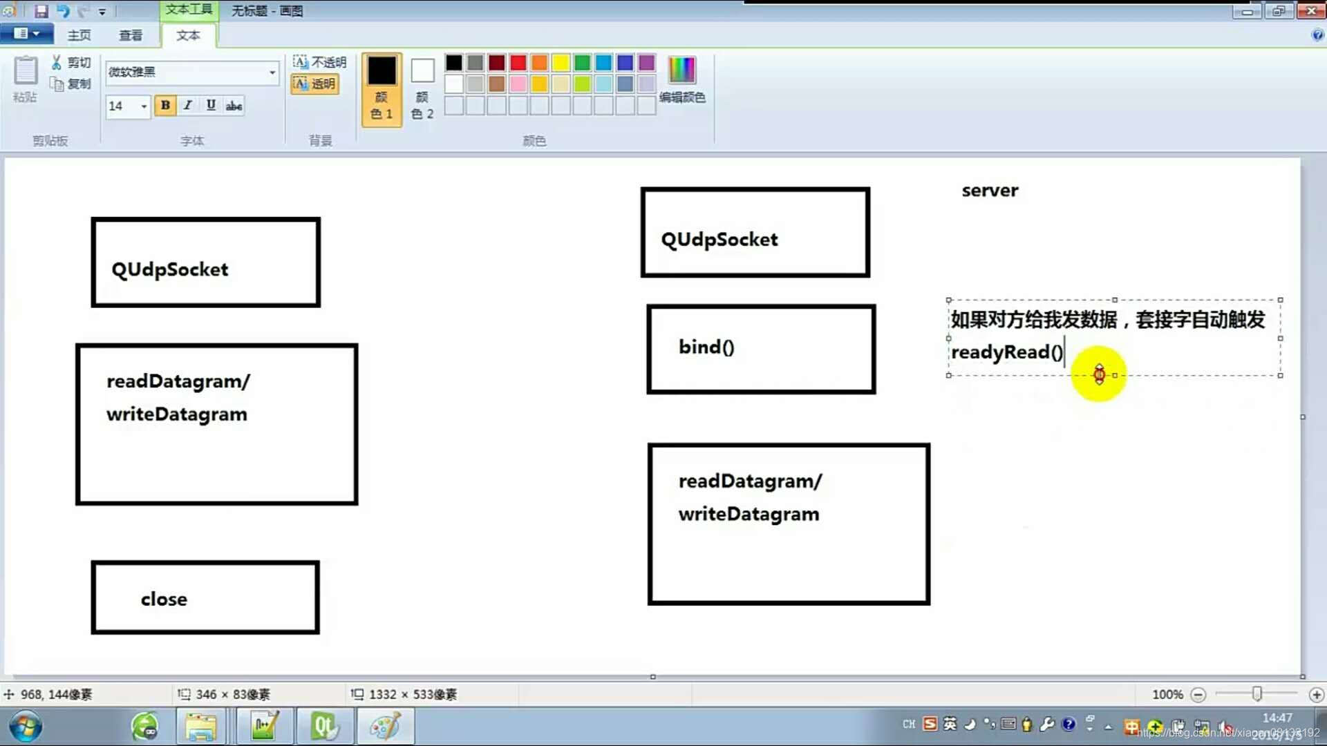 Qt中用到的套接字是QUdpSocket,然后使用bind进行绑定,然后使用readDatagram/writeDatagram进行文字的收发。如果对方给我发数据,套接字自动触发readyRead()。