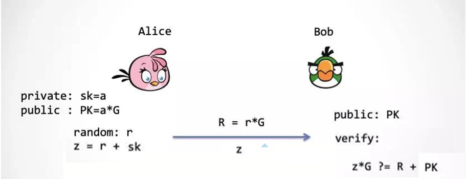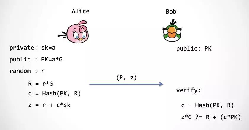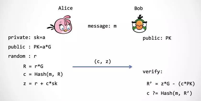 上图就是Schnorr签名方案[6]。在这里还有一个优化,Alice发给Bob的内容不是(R,z)而是(c,z),这是因为R可以通过c,z计算出来。