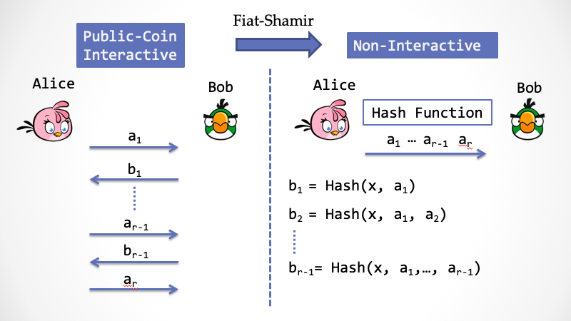 采用Hash函数的方法来把一个交互式的证明系统变成非交互式的方法被称为Fiat-Shamir变换[8],它由密码学老前辈Amos Fiat和Adi Shamir两人在1986年提出。