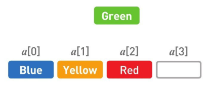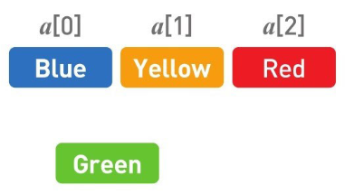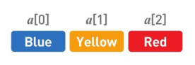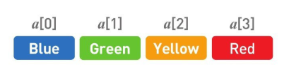 如上就是数组的概念图,Blue、Yellow、Red 作为数据存储在数组中,其中 a 是数组的名字,后面 [] 中的数字表示该数据是数组中的第几个数据,该数字也就是数组下标,下标从 0 开始计数,比如 Red 就是数组 a 的第 2 个数据。