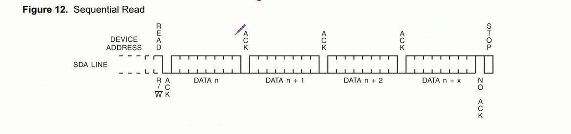 这与前面的随机指定某一个字节来读取类似,但是后面顺序读取只要有一直有应答信号产生,AT24C02就会一直顺序发送数据,直到主机产生非应答信号