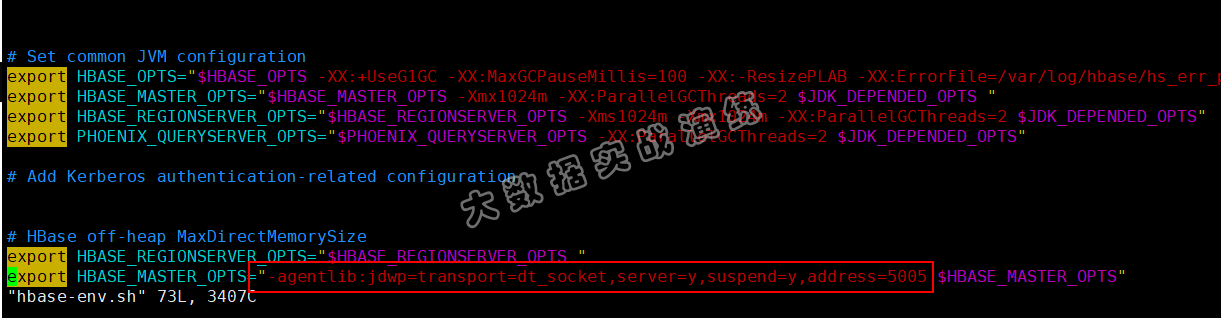 首先通过 Ambari 停止 HBase Master ,修改 HBase Master 所在主机的 hbase-env.conf 文件,在 export HBASE_MASTER_OPTS 处添加以下配置: