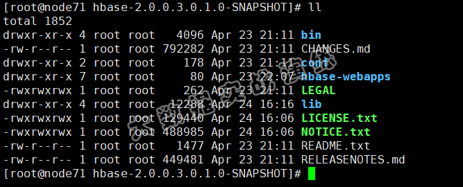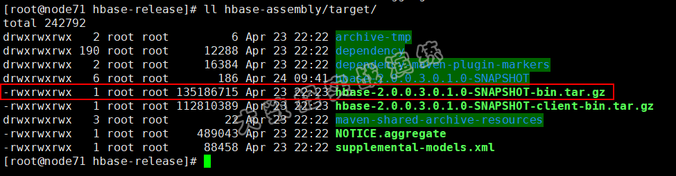 进入 hbase-assembly/target/ 目录,会发现生成了 tar.gz 包,解压以后,就是 hbase 的可运行源码了,与使用 Ambari 安装的 HBase 源码一致: