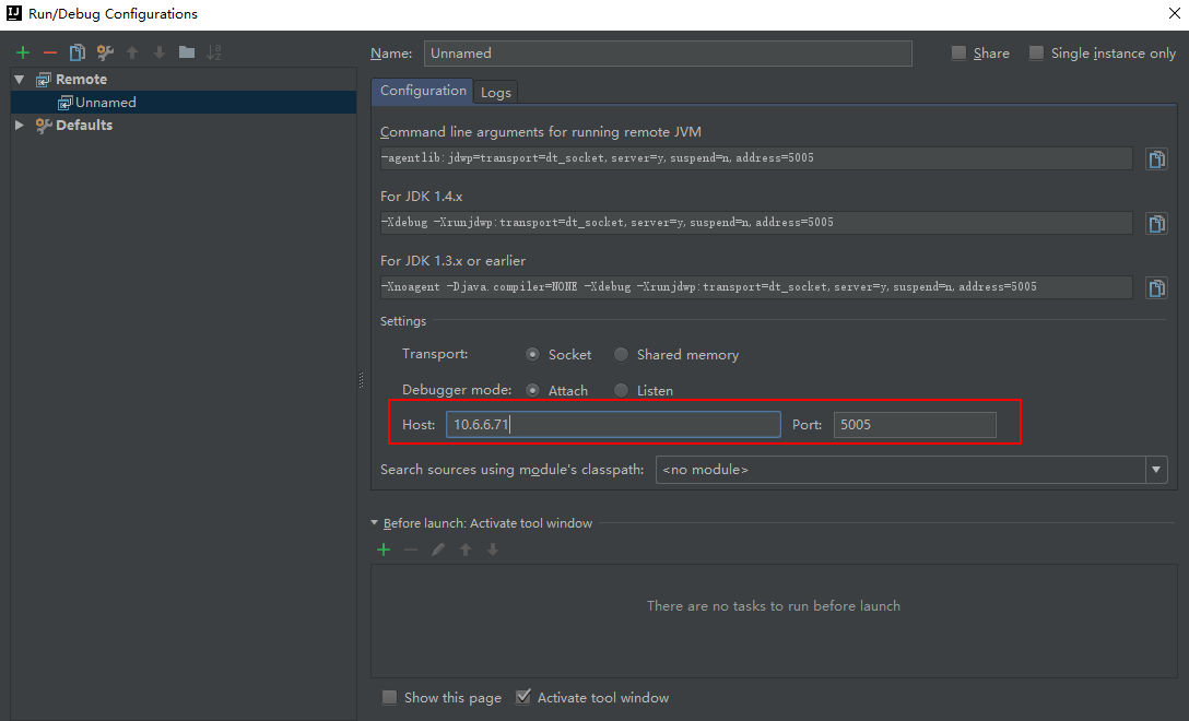 需要确保 5005 端口没有被占用,添加后如下图所示: