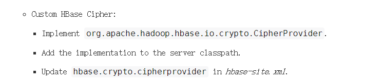 首先看到这个需求,肯定是需要先实现HBase配置AES加密《HBase配置AES加密》,或者还可以再继续了解实现SMS4加密算法《Java版SMS4加密解密算法》。等到这些都完成之后,就需要想办法实现HBase的SMS4数据加密了。这里我们要养成一种思路,那就是看官网。根据参考官网,只得到如下信息: