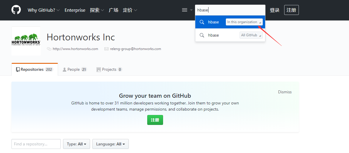 打开浏览器,访问https://github.com/hortonworks,点击右上角的搜索框,在当前 organization 内搜索你想要的 hdp 组件的源码即可。