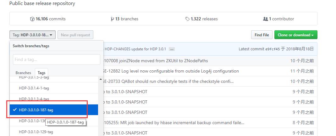 git clone -b HDP-3.0.1.0-187-tag --depth 1 https://github.com/hortonworks/hbase-release.git