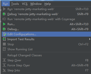 远程服务以 DEBUG 模式成功启动后,IDEA 连接上对应的 DEBUG 端口,就能打断点调试了(请确保服务端代码和本地代码一致),Run -> Edit Configurations,具体配置如下图所示: