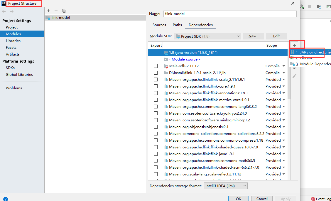 需要导入flink安装目录下jar包,选择File --> Project Structure --> Modules,选择Dependencies --> 右边加号 --> JARs or directorie