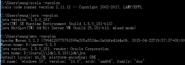 jdk、scala、maven安装方式,自行百度,不在赘述,win+r,可查看到版本接口。