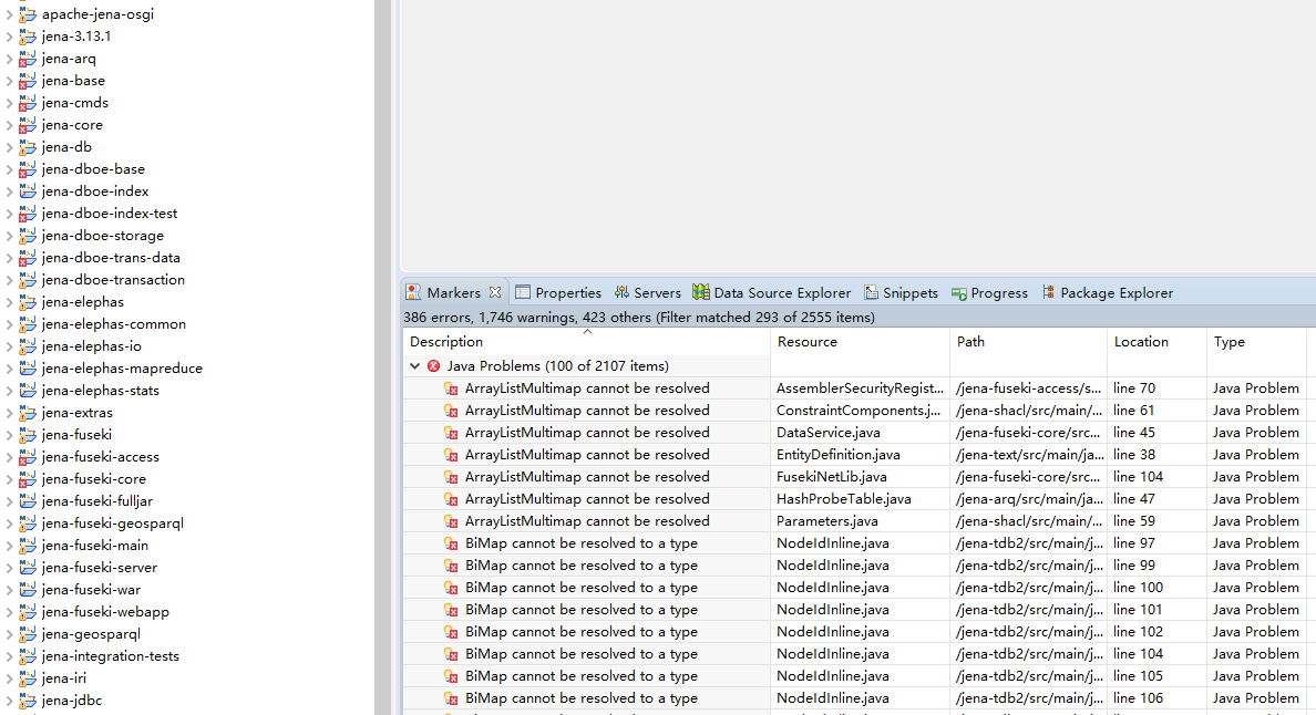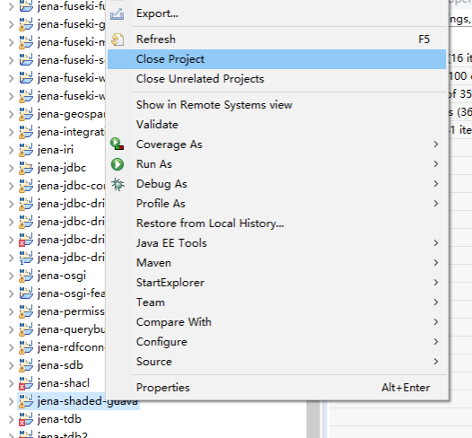 5、解决方法是确保jena-shaded-guava Maven模块在Eclipse中保持关闭状态,再重新编译或右键菜单Maven->Update Project...。