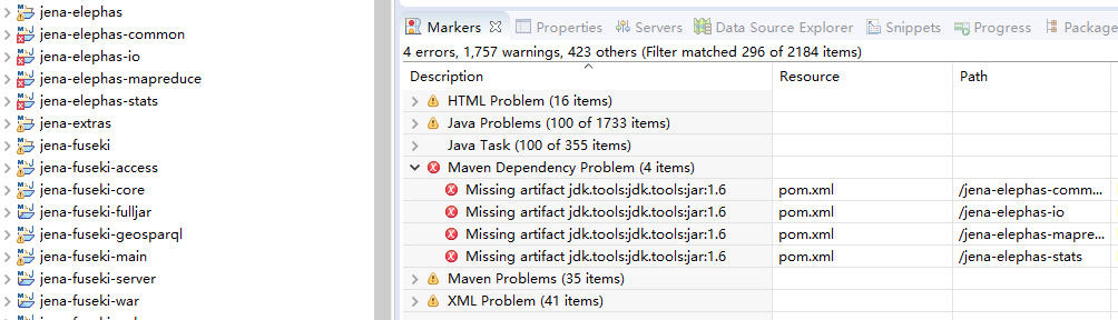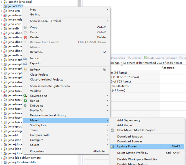 如果导入是jena-3.14.0-source-release.zip版本,会报“Unknown pom.xml Maven Configuration Problem”错误,打开对应的pom.xml文件,加入maven-jar-plugin插件代码,再右键菜单:Maven->Update Project...