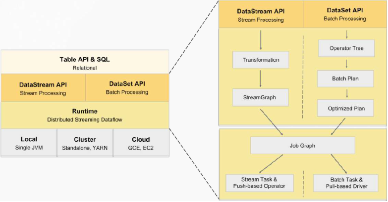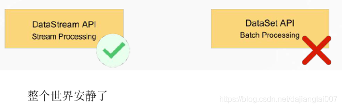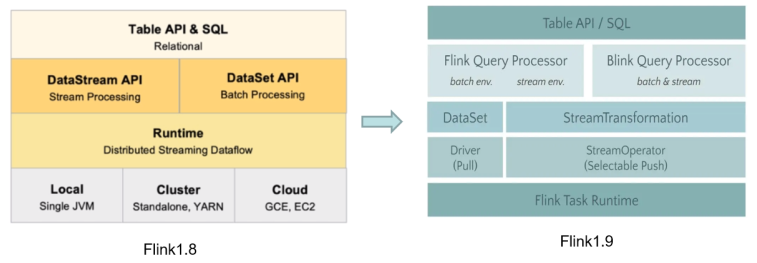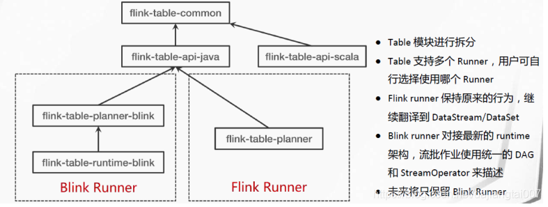 Blink本身就在做去DataSet的工作,在 Blink 捐赠给 Apache Flink 之后,社区就致力于为 Table API 和SQL 集成 Blink 的查询优化器和 runtime。第一步,我们将 flink-table 单模块重构成了多个小模块(FLIP-32)。这对于 Java 和 Scala API 模块、优化器、以及 runtime 模块来说,有了一个更清晰的分层和定义明确的接口。