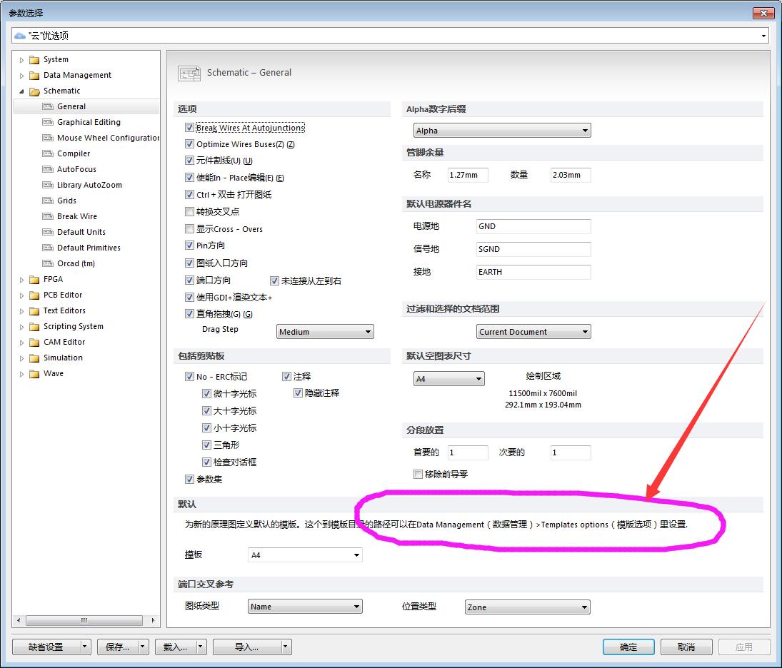 2.看下模板选择,这里我们选的是最常用的A4模板,不过这个模板带Altium图标,并且文件名带路径。看下说明,要在数据管理选项里更改,OK,继续操作。