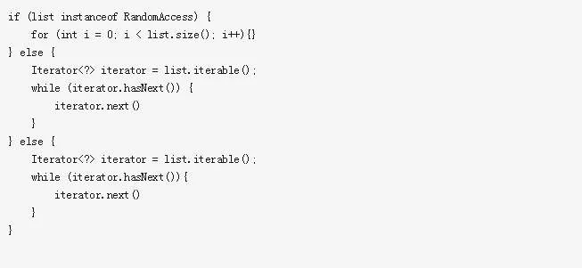 这是JDK推荐给用户的。JDK API对于RandomAccess接口的解释是:实现RandomAccess接口用来表明其支持快速随机访问,此接口的主要目的是允许一般的算法更改其行为,从而将其应用到随机或连续访问列表时能提供良好的性能。实际经验表明,实现RandomAccess接口的类实例,假如是随机访问的,使用普通for循环效率将高于使用foreach循环;反过来,如果是顺序访问的,则使用Iterator会效率更高。可以使用类似如下的代码作判断: