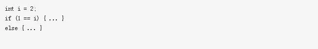 万一程序员一个不小心,把”if (i == 1)”写成”if (i = 1)”,这样就有问题了。在if之内将i赋值为1,if判断里面的内容非0,返回的就是true了,但是明明i为2,比较的值是1,应该返回的false。这种情况在C/C++的开发中是很可能发生的并且会导致一些难以理解的错误产生,所以,为了避免开发者在if语句中不正确的赋值操作,建议将if语句写为: