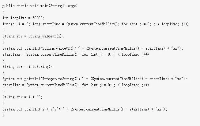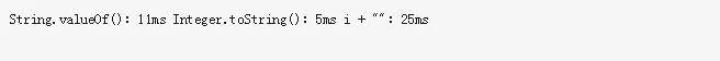 把一个基本数据类型转为一般有三种方式,我有一个Integer型数据i,可以使用i.toString、String.valueOf(i)、i+””三种方式,三种方式的效率如何,看一个测试: