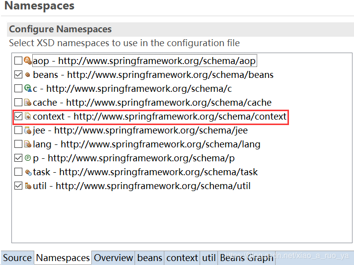 勾选context红框部分,后可在xml中使用constructor-arg标签
