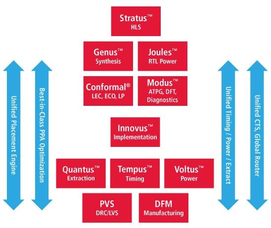 Innovus作为当家产品则为后端提供强大的布局布线功能,应用于时序和功耗和Tempus和Voltus也可圈可点,Quantus、PVS和DFM则分别用在寄生参数提取,物理验证和可制造性设计。