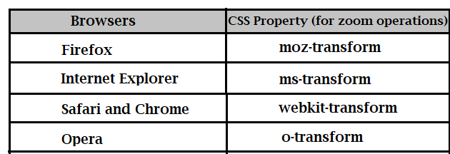 为了在进行Selenium自动化测试时放大或缩小,应使用transformCSS属性(适用于相应的浏览器),该属性可让您在页面上执行放大,缩小,旋转,倾斜等操作。不同类型的浏览器的CSS参数如下