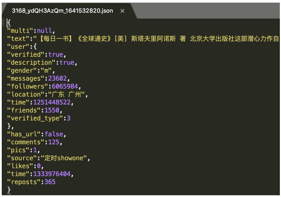 本次实践所使用的数据是从新浪微博不实信息举报平台抓取的中文谣言数据,数据集中共包含1538条谣言和1849条非谣言。如下图所示,每条数据均为json格式,其中text字段代表微博原文的文字内容。