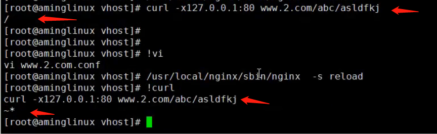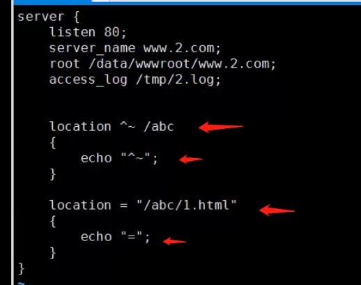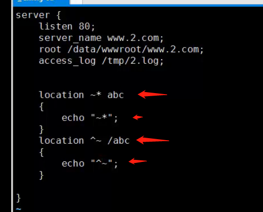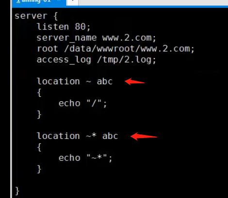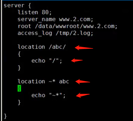 - 符号 ~* 是模糊匹配,只要后面uri里面存在 abc 字段,就可以匹配成功,位置无所谓