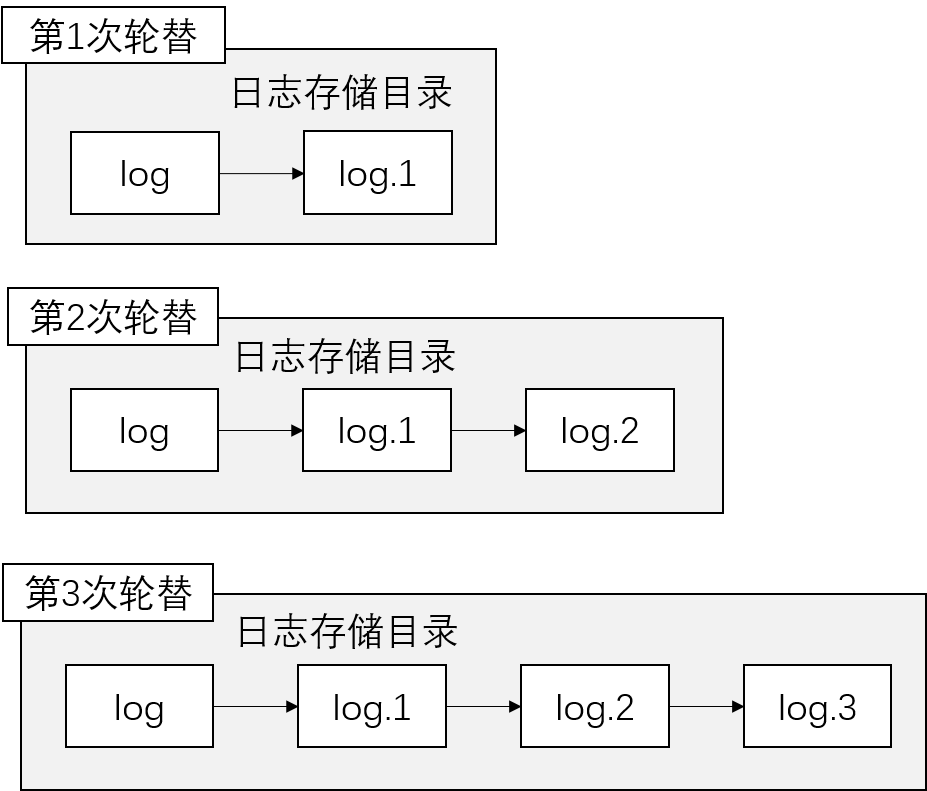 如图2所示为logrotate进行轮替操作的具体过程,当达到了周期或者日志大小达到了限制时,便触发了logrotate的轮替操作,logrotate会将log文件重命名为log.1,此时新记录的日志会重新创建log文件,因此目录下同时存在log和log.1两个文件。更进一步地,再第二次轮替时,logrotate先将log.1重命名为log.2,再将log重命名为log.1,新记录的日志同样会重新创建log文件,因此目录下同时存在log、log.1和log.2三个文件,以此类推。聪明的你可能已经想到,如果这样无限制地生成新的文件,会不会耗尽磁盘空间呢?事实上logrotate的配置中允许我们设置最多保留的日志文件个数,详细的配置内容我们将在下一节中进行讨论。