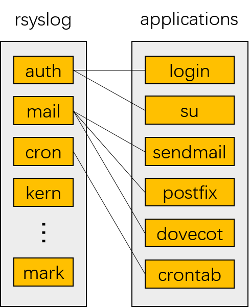 rsyslog的服务名称是怎样与应用程序关联起来的呢?如下图所示,应用程序可以调用rsyslog中对应的服务名称,例如login和su调用auth,所以与auth关联,sendmail、postfix和dovecot调用mail所以与 mail关联,而contrab则与cron关联。