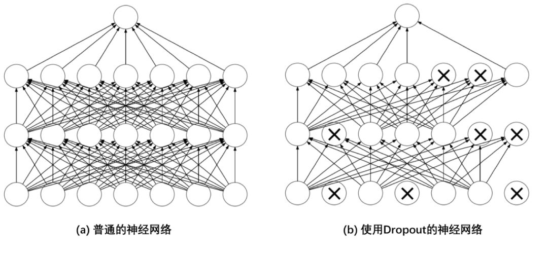 图11 是Dropout示意图,左边是完整的神经网络,右边是应用了Dropout之后的网络结构。应用Dropout之后,会将标了的神经元从网络中删除,让它们不向后面的层传递信号。在学习过程中,丢弃哪些神经元是随机决定,因此模型不会过度依赖某些神经元,能一定程度上抑制过拟合。