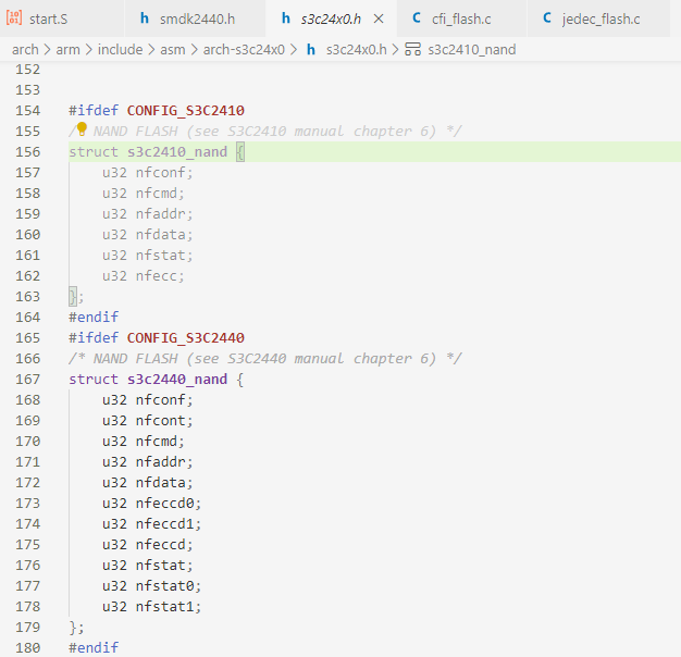 接下来问题就变为struct s3c2410_nand这个结构体定义有问题,继续寻找该定义,果然,在文件arch/arm/include/asm/arch-s3c24x0/s3c24x0.h中,我们定义的是CONFIG_S3C2440,所以有struct s3c2440_nand的定义,没有struct s3c2410_nand的定义: