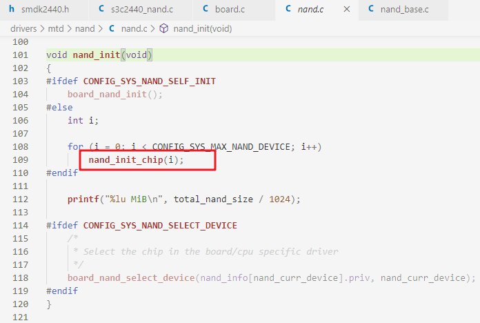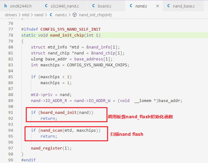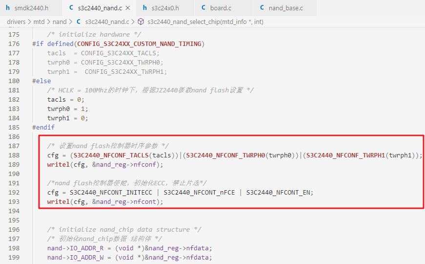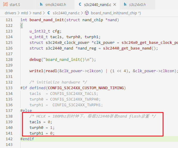 board_nand_init 函数定义在上面我们自己添加的文件drivers/mtd/nand/s3c2440_nand.c中,该函数中主要使能了nand flash内存控制器,初始化nand flash控制器中的时序参数,最重要的是: