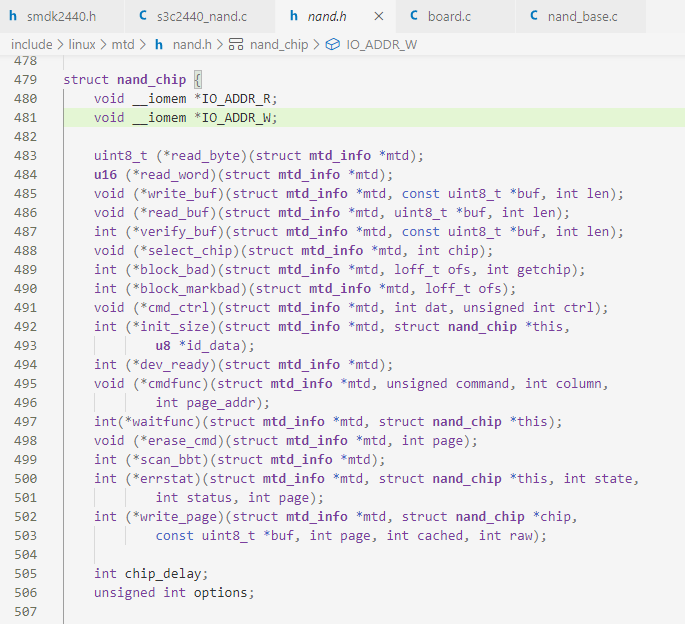 struct nand_chip结构体在include/linux/mtd/nand.h文件中定义,这个结构体中的成员非常多,其中有非常多的函数指针,这些函数指针在初始化时被设置为指向底层实现的函数,在调用时拉起底层函数。