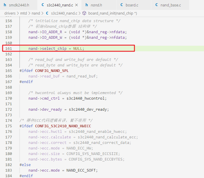 在board_nand_init 中初始化该结构体时,别的函数指针都被传入了相应的值,只有 select_chip 函数未被传入具体实现,而是NULL: