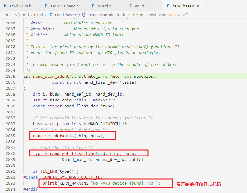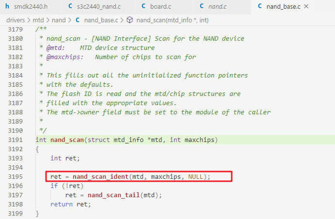 这个函数将mtd结构体指针继续传给了nand_scan_ident函数,接着分析,这个函数同样在该文件中定义,根据函数注释可知,nand_scan_ident 函数会读取Flash ID,并根据读出的ID设置MTD信息,存入mtd结构体中。