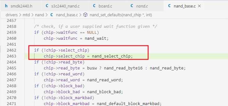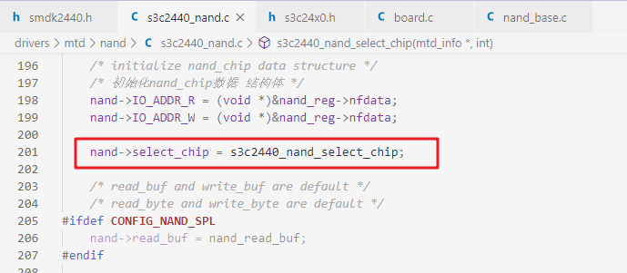 解决方法就是:自己重新实现一个正常工作的 nand_select_chip 函数并将函数指针传给nand_flash结构体中的对应成员。