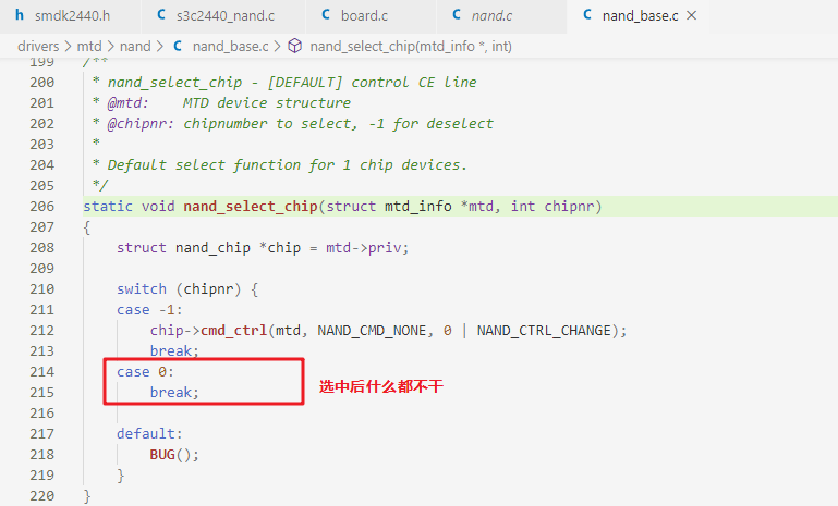 默认函数 nand_select_chip 也同样定义在该文件中,定义如下: