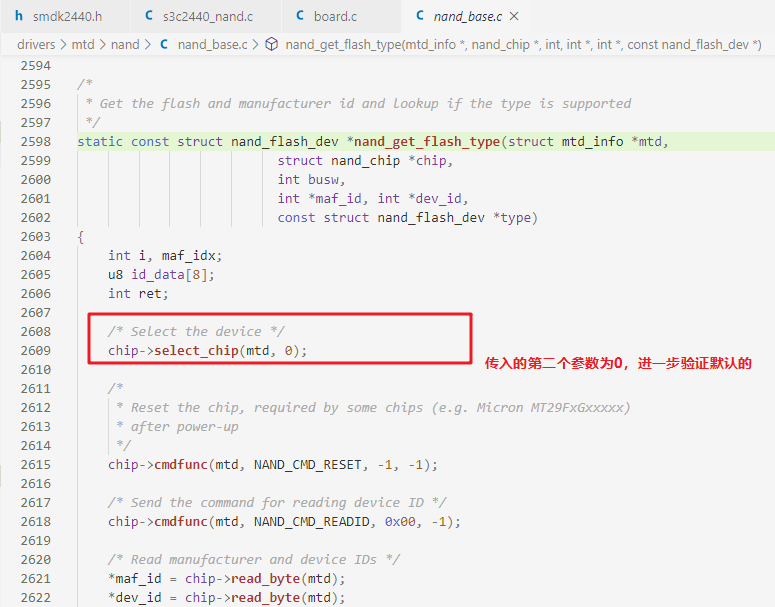 在该函数中,调用select_chip时传入的第二个参数为0,进一步验证了默认的片选函数什么都不干的分析结果。